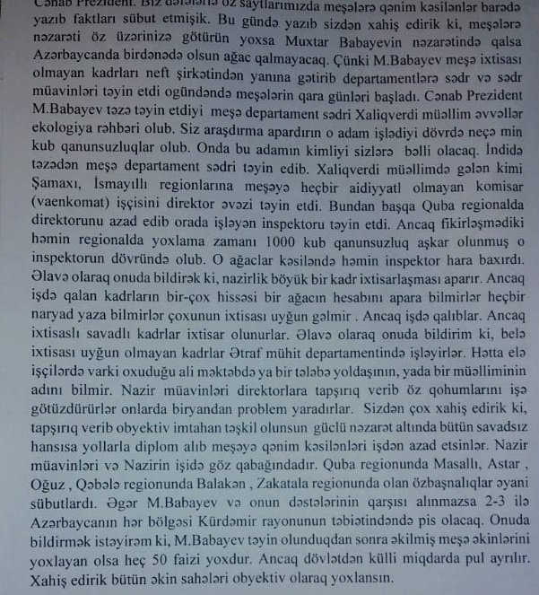 “Meşələrin İnkişafı Xidmətinin rəisi Xalıqverdi Hüseynov Ətraf Mühitin rəisi işlədiyi zaman meşələri məhv edənlərdən biri olmuşdur və buna baxmayaraq bu şəxs xəstə olduğu və pensiya çıxma vaxtına bir il qaldığı halda Muxtar Babayev onu gətirib Meşələrin İnkişafı Xidməti vəzifəsinə rəis təyin edib. Etibarlı mənbə onu da xüsusi vurğulayır ki,