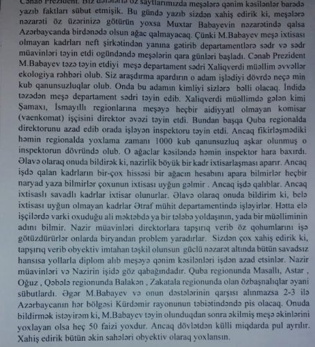 Digər mənbənin ETSN naziri cənab Muxtar Babayev və onun yeni vəzifəyə təyin etdiyi X.Hüseynov barəsində dövlət başçısına ünvanladığı müraciətin bəzi hisələrini də oxuculara təqdim etmək istəyirik. Belə ki, uzun müddət meşə sahəsində işləmiş mənbə qeyd edir ki, Xaliqverdi Hüseynov əvvəllər ekologiya sahəsinə rəhbərlik etdiyi dövrdə region meşələrində qanunsuz aparılmış neçə min kub m kəsintiyə görə nəinki cəzalandırdılar, əksinə “dövlət qulluğu” medalı ilə təltif etdilər. Bu adam xidmət rəisi təyin olunan kimi Şamaxı-İsmayıllı regionlarına keşmiş hərbi komisar olmuş, heş bir meşə anlayışı belə olmayan birisini direktor əvəzi təyin etmişdir. Eləcədə Quba regionuna da peşəkar və yüksək ixtisaslı kadrı direktor vəzifəsindən azad edərək yerinə adi bir inspektoru təyin etmişdir. Hansı ki, həmin regionda ETSN tərəfindən aparılan yoxlama zamanı həmin inspektorun nəzarət etdiyi meşə sahəsində 1000 kub m. qanunsuz kəsintilər aşkar edilmişdir. Bir sözlə, hazırda Xalıqverdi ixtisaslı kadrları özünə yaxın olan savadsız və meşə işlərindən sadə anlayışları olmayan “kadrları” təyin etməklə məşğuldur. Yaxşı olardı ki, kadr məsləsinin seçimi zamanı attestasiya aparılsın. Elə meşə sahə rəisləri vardır ki, onlar adi bir sənədi belə yaza bilmirlər. Mənbə sonda dövlət başçısından xahiş edir ki, ETSN –də bu özbaşnalıqlar belə sürətlə davam edərsə yaxın 2-3 ildə Azərbaycanın hər bir bölgəsi Kürdəmir rayonun təbiətindən də pis günə qalacaqdır.