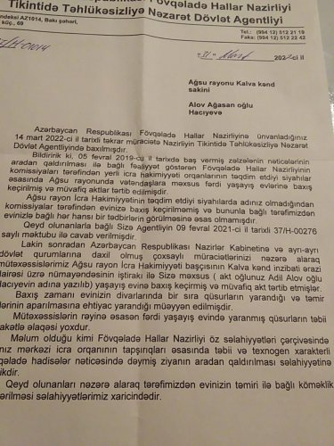 Cənab Alov Hacıyevə FHN-nin Tikintidə Təhlükəsizlik Dövlət Agentliyinin sədr müavini Elxan Əsədovun ona göndərdiyi 31 mart 2022-ci il tarixli cavab məktubunu sözün əsl mənasında müharibə veteranını ələ salmaq kimi başa düşmək olar. Belə ki, məktubda bildirilir: “ Sizə məxsus yaşayış evinə baxış keçirilmiş və akt tərtib edilmişdir. Evə baxış zamanı divarlarda bir sıra qüsurların yarandığı və təmirə ehtiyac olduğu müəyyən edilmişdir. Mütəxəssislərin rəyinə görəfərdi yaşayış evində yaranmış qüsurlar təbii fəlakətlə əlaqəsi yoxdur. Ona görə də sizin mnzilin təmir etmək Fövqəladə Hallar Nazirliyinin səlahiyyəti xaricindədir...”