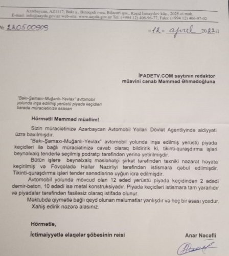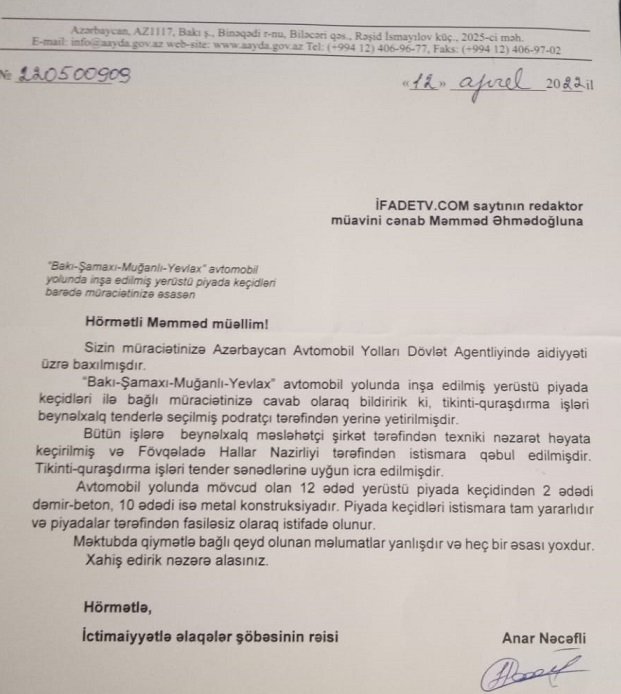 P.S. "Polat Yol Yapı" icraçı şirkətin texnii direktoru Zəfər bəylə tlefon danışığı zamanı bildirmişdir ki, sorun bizdə deyi, bizə nə qədər para ayrılırsabiz də o qədər iş görmüşük. Yəni bu müsahibədən gün kimi aydın olur ki, Sifarişçi təşkilat olan Azərbaycan Avtomobil Yolları DA-yi heç ə yol ikintisi üçün nəzərdə tutulan pul vəsaitinin bir hissəsni podratç təşkilata erirlər. Yəni, AAYDA ASC podratçı təşkilat hesab edilən "Polat Yol Yapı" ilə gizli sövdələşərək dövət başçısının Sərəncamları əsasında ayrılan pulların 80 %-ni şərikli məimsəyirlər.