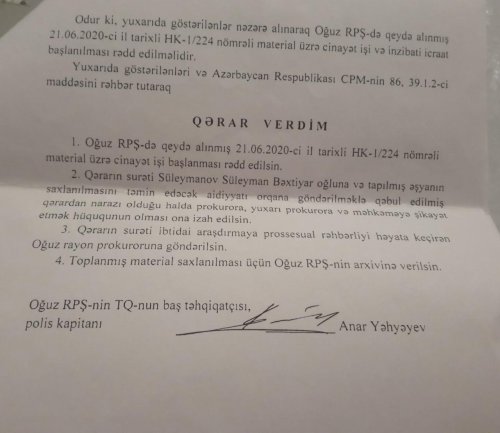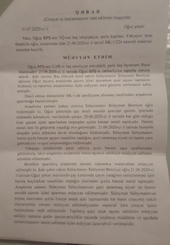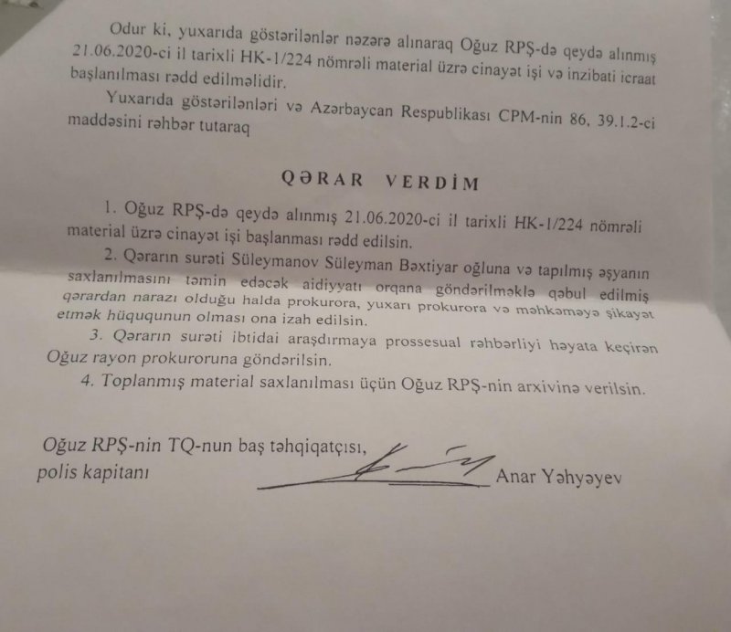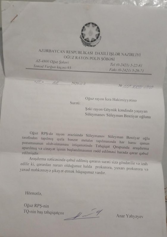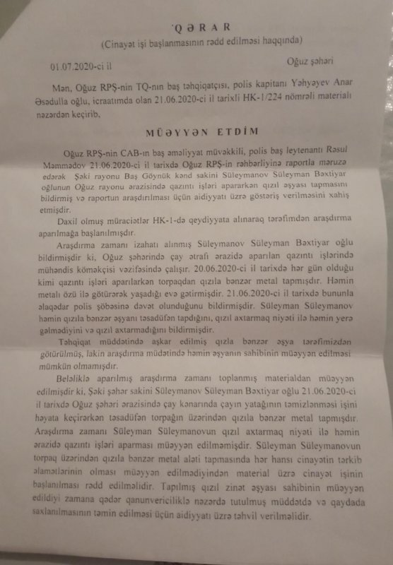 Çoxhörmətli Mehriban xanım əvvəlcə bildirim ki, mən işçisi olduğum təşkilat tərəfindən 2020-ci ilin iyun ayının 20-də Oğuz şəhərinin yuxarı hissəsidə çay kənarında qazıntı işləri aparırdıq. Birdən qarşımda 10 qəpiklik ölçüdə, üzərində 1030 rəqəmi və ərəb yazısı yazılmış bir qızıl sikkə aşkar etdim. Mən bu barədə yerli Oğuz rayon Polis Şöbəsinə məlumat verdim. Təhqiqatı aparan Oğuz rayon PŞ-nin baş təhqiatçısı , polis kapitanı Anar Yəhəyev mənim hadisə baş verən yerdə, yəni çay kənarında qədim qızıl əşyanın tapıldığı yerdə əlimdə tutmuş vəziyyətdə fotoşəkillərimi çəkdilər. Təxminən 1 həftə sonra isə yaşadığım ünvana 01 iyul 2020-ci il tarixli, "Cinayət işinin başlanmasının rədd edilməsi" barədə Qərarı göndərdilər. Həmin qərarın ikinci bəndində qeyd edilir ki, "tapılmış əşyanın saxlanması təmin edəcək aidiyyatı orqana göndərilməklə qəbul edilmiş qəradan narazı olduğu halda şikayət etmək hüququ izah edilsin.