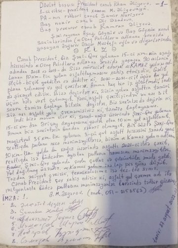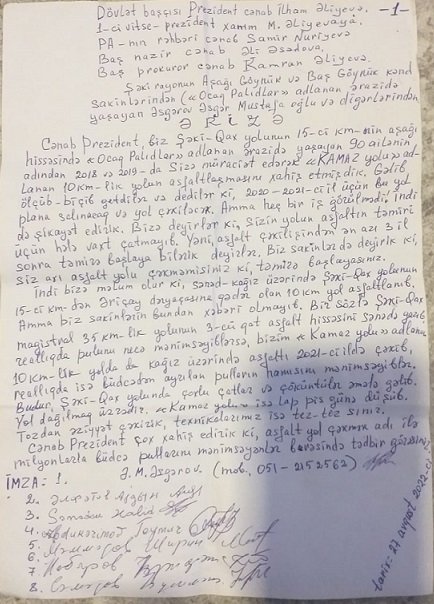 Cənab Prezident, biz Şəki-Qax yolunun 15-ci km-nin aşağı hisəsində "Ocaq Palıddar" adlanan ərazidə yaşayan 90 ailənin adından 2018 və 2019-cu illərdə Sizə müraciət edərək "Kamaz yolu" adlanan 10 km-lik yolun asfaltlanmasını xahiş etmişdik. Gəlib ölçüb-biçib getdilər. və dedilər ki, 2020-2021-ci illər üçün bu yol plana salınacaq və yol çəkiləcək. Amma heç bir iş görülmədi. Bezib indi də şikayətlər etdik. Bizə deyirlər ki, sizin yolun asfaltın təmiri üçün hələ vaxt çatmayıb. Yəni, izah etdilər ki, yeni asfalt çəkilişindən ən azı 3 il vaxt keçməlidir ki, sonra təmirə başlaya bilək. Biz sakinlər də deyirik ki, siz axı asfalt yolu çəkməmisiniz ki, təmrə də başlayasınız. İndi bizə məlum olur ki, sənəd-kağız üzərində Şəki-Qax yolunun 15-ci km-dən Əriçay dəryaçasına qədər olan 10 km yol asfaltlanıbmış. Amma biz sakinlərin bundan xəbəri olmayıb. Bir sözlə, Azəravtoyol Şəki-Qax magistral 35 km-lik, 9 m eni olan yolun 3-cü qat asfalt hissəsini sənəddə yazıb, reallıqda isə pulunu necə mənimsəyiblərsə, bizim "Kamaz yolu" adlanan gözdən uzaq 10 km-lik yolu da kağız üzərində asfaltı 2021-ci ildə çəkiblər, reallıqda isə büdcədən bu təyinat üzrə ayrılan pulların hamısını mənimsəyiblər. Budur, Şəki- Qax yolunda çoxlu atlar, və çoküntülər əmələ gəlib Yol dağılmaq üzrədir. "Kamaz yolu" isə lap pis günə düşüb. Tozdan əziyyət çəkirik. Texnikalarımız isə tez tez sınır.