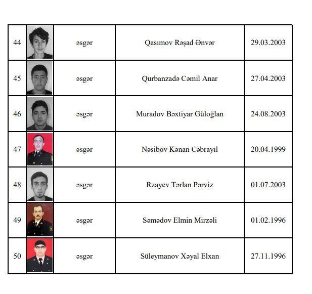 Bildirilib ki, MN-in yaydığı siyahıda Lerikin Niyəvud kəndindən olan Coşqun Ədail oğlu Zülfiyevin, Ağstafanın Böyük Kəsik kənd sakini, 1993-cü il təvəllüd Səyfəddin Mahmud oğlu Muradovun, Qusar rayonu Mucuq kənd sakini, 1998-ci il təvəllüd XTQ snayperi Şair Camal oğlu Heydərovun, Tovuzun Alakol kənd sakini, 1991-ci il təvəllüd hərbçi Ülvi Məzahir oğlu Mahmudzadənin adı olmasa da, yaxınların hərbçilərimizin şəhid olduğunu təsdiqləyiblər.