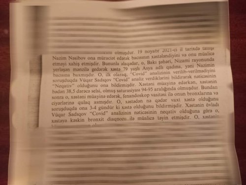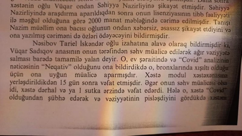 Qərarın bir yerində həkim Nəsibov Tarielin izahatında xəstənin COVİD testinin neqativ olduğuna və bronxlarında xışıltı eşitdiyinə görə kəskin bronxitə görə müalicə yazdığı bildirilir.Bu Tariel onu da yazıb ki ,əgər səhv müalicə etsə idi,xəstə dərhal və ya bir sutka ərzində vəfat edərdi...Normal müstəntiq üçün elə həkimin bu ifadəsi bəs etməli idi ki,şübhəli məqamları müəyyənləşdirsin.Amma müstəntiq ekspertizaya tələsib.