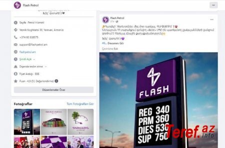 TEREF.AZ yeniavaz.com-a istinadla xəbər verir ki, hazırda Ermənistanın aparıcı yanacaqdoldurma məntəqlərindən (YDM) olan “Flash Petrol”da Aİ-92 (“Regular”) markalı benzin 340 drama (86 sent), Aİ-95 ("Premium") markalı benzin isə 360 drama (91 sent) satılır.