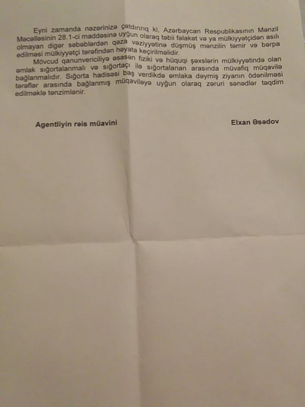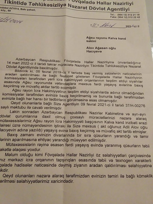 Cənab Alov Hacıyevə FHN-nin Tikintidə Təhlükəsizlik Dövlət Agentliyinin sədr müavini Elxan Əsədovun ona göndərdiyi 31 mart 2022-ci il tarixli cavab məktubunu sözün əsl mənasında müharibə veteranını ələ salmaq kimi başa düşmək olar. Belə ki, məktubda bildirilir: “ Sizə məxsus yaşayış evinə baxış keçirilmiş və akt tərtib edilmişdir. Evə baxış zamanı divarlarda bir sıra qüsurların yarandığı və təmirə ehtiyac olduğu müəyyən edilmişdir. Mütəxəssislərin rəyinə görəfərdi yaşayış evində yaranmış qüsurlar təbii fəlakətlə əlaqəsi yoxdur. Ona görə də sizin mnzilin təmir etmək Fövqəladə Hallar Nazirliyinin səlahiyyəti xaricindədir...”