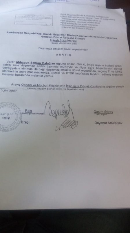 Ailəmiz dörd nəfərdən ibarətdir. Mən, həyat yoldaşım və himayəmdə iki qız övladım var. Bu müddət ərizində məcburi köçkünlər üçün ayrılmış müavinətdən yararlanmışıq. Lakin son iki ildir ki, məcburi köçkünlər üçün ayrılmış dövlət müavinətindən məhrum edilmişəm. Aidiyyatı təşkilatlara bu barədə müraciət etdikdə, səbəb olaraq mənim adıma mənzil olduğunu bildirdilər. Lakin mən məsələ ilə əlaqədar Qaçqın və Məcburi Köçkünlərin İşləri üzrə Dövlət komitəsinə təqdim etmək üçün , Azərbaycan Respublikası Əmlak Məsələləri Dövlət Komitəsinin yanında Daşınmaz Əmlak Dövlət Reyestri Xidmətinə arayış üçün müraciət etdim. Müraciətim əsasında mənə 6-saylı ərazi idarəsindən arayış təqdim etdilər.