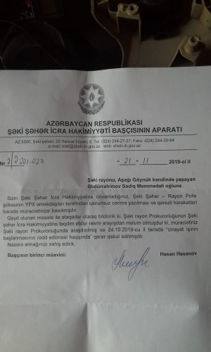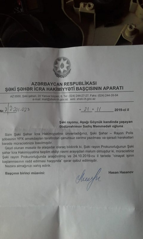 Rəsmən bildirilir ki, Şəki Rayon Prokurorluğu S.Əbdürəhimovun şikayəti əsasında aparılan araşdırmada "cinayət işinin rədd edilməsi" barədə 24.10.2019-cu il tarixli qərar qəbul etmiş və qərar şikayətçiyə göndərilməmişdir.