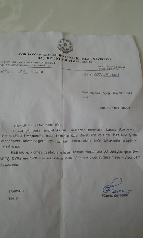 Şikayətimin nəticələri: 24 noyabrda Şəki İH tərəfindən verilən cavabdan aydın olur ki, 24 oktyabrda Şəki rayon prokurorluğunda şikayətim əsasında aparılan araşdırmaya əsasən cinayət işinin başlanmasının rədd edilməsi barədə qərar qəbul edilmişdir. Mənə isə hələ də 1 aydır ki, əsassız və saxta qərarın surəti göndərilmir. Elə ona görə müstəntiq Tural izahatı yazanda mənə təzyiq edirdi ki, qısa yaz, çox yazma. İndi aydın olur ki, müstəntiq niyə Aqşini və digər Yevlax şossesinə nəzarət edən və mənə saxta protokol yazan DYP işçilərini niyə araşdırmaya cəlb etməmişdir. O yalnız Adamovla bağlı epizodu xalaxətrin qalmasın deyə araşdırmış və onun xeyrinə yekunlaşdırmışdır. Oğurladıqları avtomobili, 10 mantlıq cəriməni silmək üçün şahid yanında istənilən 200 manat tələb edilən rüşvət haqqında, cərimənin ödəmə qəbzinin nəzərə alınmaması, radar cərimələrini yoxlayan və hər bir kənd üzrə belə sürücüləri araşdırıb tapdıqdan sonra onların evinə dədəsinin 10 DJ 106 nömrəli avtomobili ilə DYP işçisi Adamovla birlikdə gedib dələduzluqla məşğul olan bu dəstəyə hüquqi qiymət vermək əvəzinə, formal tərtib etdikləri araşdırmanın nəticəsiə görə “cinayət işinin rədd edilməsi” barədə əsassız QƏRARq əbul edilmişdir. Elə DİN-ndən rayonumuza mənim şikayətim əsasında təşrif buyurmuş polis polkovnik-leytenantı Ceyhun Əliyev də öz paqon yoldaşları ilə həmfikir olmuşdur.