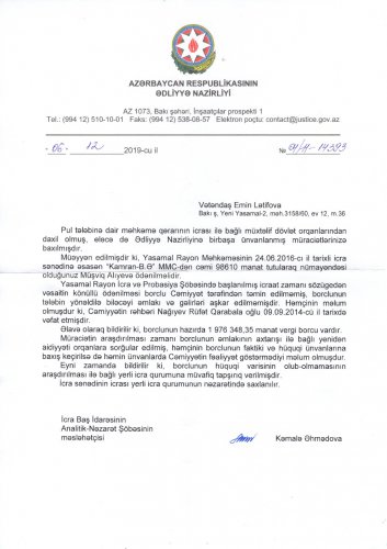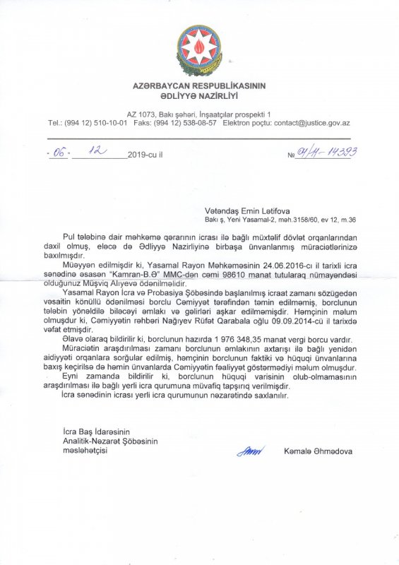 Dələduzluq faktı üzrə mən də bir zəzərçəkən olaraq Baş Prokurorluğa və Daxili İşlər Nazirliyinə rəsmi müqavilə bağladığım “Kamran B.Ə.” MMC barəsində müraciətlər etdim. Nəticədə AR Baş Prokurorluğundan bir neçə rəsmi cavab aldım ki, “İstintaq dövründə mənim ərizəm daxil olmadığına görə məni zərəçəkən şəxs kimi tanımaq mümkün olmamışdır.” Uzun müddət müraciətlərimə baxmayaraq mənim hüquqlarımın müdafiəsi üçün heç bir ölçü götürülmədi.