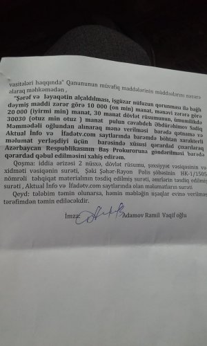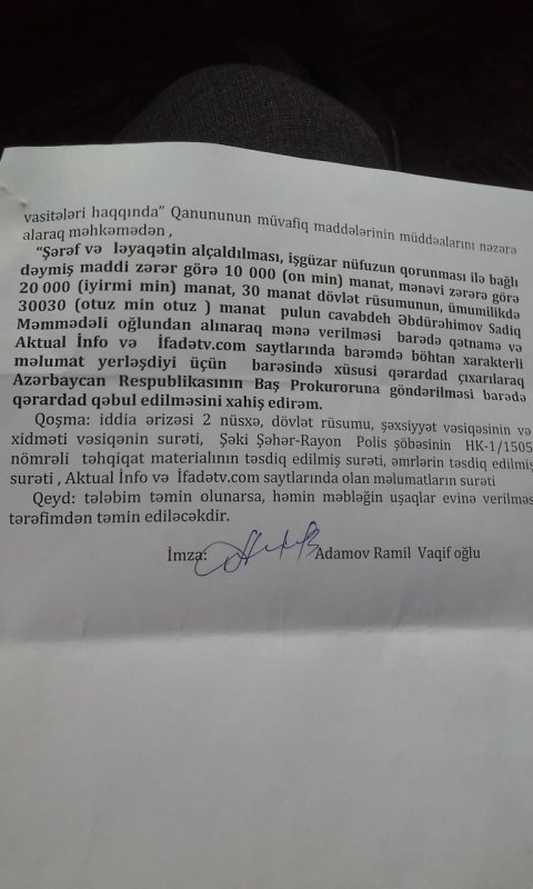 Düzdür, oğlum onu döyənlərdən deyil, sifariş verən caninin tapılıb cəzalandırması üçün 26 noyabrda yenidən şikayət vermişdir. Və hazırda da Şəki polisində araşdırma formal olaraq davam edir. Bunu görən DYP polisi Ramil Adamov dekabrın 24-dək oğlumun qaynatası Ziyəddinə və digər şəxslərə zənglər edərək yenə şikayətini geri götürməsini onun bu döyülmə işinə aidiyyatının olmamasını bildirmiş və Şəki DYP idarəsinə dəvət edərək onun avtomobilinə dəymiş zərərəi ödəməyə hazır olduğunu bildirmişdir. Oğlumun bu şərtlərlə razılaşmadığını bildikdən dərhal sonra R.Adamov vəziyyətdən çıxış yolu kimi Sadiqi qorxutmaq və cəzalandırmaq üçün onun barəsində iddia qaldırararaq ona dəymiş 10000 manat maddi və 20000 manat mənəvi ziyanın ödənilməsi tələbi ilə Şəki məhkəməsinə müraciət etmişdir. Maraqlı burasıdır ki, iddia elə verildiyi gün, 24 dekabrda hakim Pərviz Hacıyevin icraatına verilmiş və dərhal da bildiriş poçtla göndərilərək ildırım sürətilə yeni ilin birinci iş gününə hazırlıq iclası təyin olunmuşdur. Bundan artıq sifariş necə olur, hörmətli mənim qohumum Fikrət Məmmədov? Nəticəsi əvvəldən bəlli olan məhkəmədə Ramil Adamovun məqsədi budur ki, sentyabr ayında mənə verilən şəhid oğlum Faiqin “qan pulu” olan 11000 manat pulu bu formada ələ keçirsin. Amma onun tələb etdiyi 30000 manat pulun hamısını vermək iqtidarında deyilik axı.