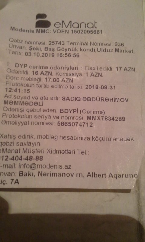 Sadiq yaxındakı “Ulduz” marketdəki aparatda cəriməni ödəməyə tanışını göndərir. O saat 16-50 dəqiqədə 16 manat cəriməni ödəniş edib gələndə, polis R. Adamov qəbzə baxmadan avtomobiliə oturub özbaşına sürüb gedirlər., Oğlum da DİN-nin 102 xidmətinə zəng edir.
