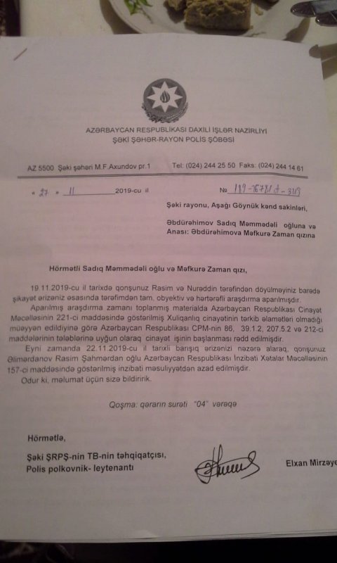 Məsələ Şəki Prokurorluğunda və Polisində araşdırlır və ört basdır edilir. DYP əməkdaşı Ramil Adamov Sadiqin əmisi oğlu Mehdinin 077 500 70 05 mobil nömrəsinə gizli nömrədən 11 oktyabrda zəng edərək oğlumun gedib şikayət ərizəsini geri götürməyii tələb etmiş, bu günün sabahı da var deyərək hədə qorxu gəlmişdir. Polis R.Adamovun bu hədə-qorxusunun qarşısını almaq üçün Sadiq Əbdürəhimov 25 oktyabr 2019-cu ildə DİN-ə,şəxsən cənab Vilayət Eyvazova özünün və ailəsinin təhlükəsizliyinin təmin edilməsi barədə rəsmi müraciət göndərmişdir.