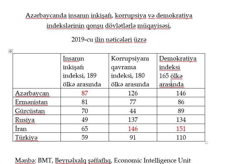 İqtisadçı alim bildirib ki, insanın inkişafı, korrupsiyanı qavrama və demokratiya indeksləri əsasında tərtib olunan və bu yazının şəkil bölməsində yerləşdirilən cədvəlin məlumatları eyni metodologiyaya əsaslanır və 2019-cu ilin nəticələri əsasında son vəziyyəti xarekterizə edir: "Diqqətlə baxın, görəcəksiniz ki, bir çox məsələlərdə qonşulardan geri qalır, bəziləri üzrə irəli çıxa bilmişik. Belə ki, cədvəldə təqdim olunan insanın inkişafı üzrə Azərbaycan hətta cənub qonşusu İranla müqayisədə belə zəif mövqedə, yerləşdiyimiz bölgədə ən pis durumdadır. Korrupsiyaya səviyyəsinə görə Azərbaycan Cənubi Qafqazın ən korrupsiyalaşmış dövləti olsa da, İran və Rusiya ilə müqayisədə yaxşı görsənir. Demokratiya indeksində isə biz bölgədə yalnız İrandan üstün durumdayıq, digər 4 dövlətdən pis mövedəyik. Məlumat üçün onu da əlavə edim ki, insanın inkişafı indeksi özündə 3 vacib göstəricini - adambaşına düşən milli gəlir, savadlılıq və orta ömür uzunluğu - ehtiva edir. Göründüyü kimi, insanın inkişafı iqtisadiyyatın, təhsilin və səhiyyənin durumu əsasında qiymətləndirilir". Qubad İbadoğlu hesab edir ki, bu göstəricini yaxşılaşdırmaq üçün iqtisadi artımı sürətləndirməli, təhsil və səhiyyənin keyfiyyətini yüksəltməliyik: "Buna isə yalnız kompleks və gerçək islahatlarla nail olmaq mümkündür".